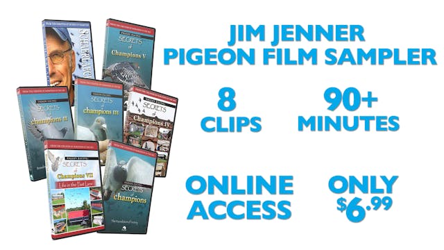 If you haven't seen Jim Jenner's films here are few chapters to see. Included are selected stories from Secrets of Champions 1,2,3,4,5 & 7 as well as a short piece on Ad Schaerlaeckens. You'll want to rent or buy more in this award-winning series of pigeon films.